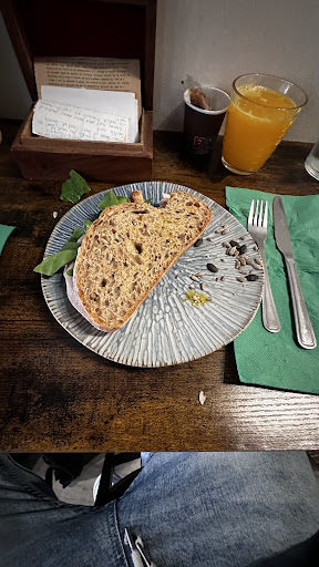 Read moreThe place is very small with nowhere to sit and was empty at 10am on a Sunday, only 3 people sitting, two girls behind the bar busy doing coffees. You sit where you like, there’s no table service I was told. I ordered an orange juice, small bottle of water and the large turkey ham sandwich: 12 euros. Food is bad, the sandwich is small, one (literally) slice of ham cut in two, some jam, some scattered seeds and a leaf of salad. No music, loads of chairs left packed at the entrance, no space to sit as the place is tiny, quick and rude service and left as hungry as I arrived. Find yourself a better option somewhere else. (The fork in the photo is a dessert fork so you understand how small that sandwich was) PS: the menu is just mostly vegetarian sandwiches and bowls.