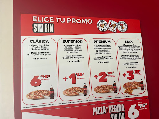 Read moreTe dan la bebida sin tapón para que se le vaya el gas a la bebida y sea agua . Te ponen el tamaño de pizza como le convenga a ellos , empiezan con una familiar y terminan poniéndote en el buffet medianas para que te vayas antes . Aparte mientras que estábamos comiendo , tenían prisa por recoger y cerrar el local y quedaban dos horas para que cerrase. Mientras que estábamos comiendo teníamos que aguantar que nos barriesen los pies , que estuviesen poniendo las mesas a la ligera incluso no dejándonos comer tranquilos , cerrando las puertas para que nadie entrase y recogiendo las mesas y apilandolas sin limpiarlas . De echo la mesa que nos sentamos tuvimos que pedir una balleta para limpiarla nosotros mismos, porque le pedimos repetidamente la balleta o que la limpiaran y nos ignoraban , solo estaban pendiente de los buffet que tenian en el local , quejándose de que tenían que hacer pizzas a ultima hora del cierre . Además nos despedimos y nos ignoraron de nuevo . La próxima me...