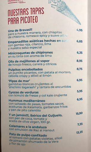 We ordered Pipas de Mar or small crunchy shrimps, Calamares a la Andaluza, a modern interpretation of a classic Andalusian dish, Olla de Mejillones al Vapor, a small pot of steamed and tasty mussels, and a staple dish such as Braves potatoes. As we had only intended to have a few appetizers, we finished our brief first visit with a very recommendable mango desert. All dishes were pleasing, and we’re eager to return to try the many interesting and varied options on the...