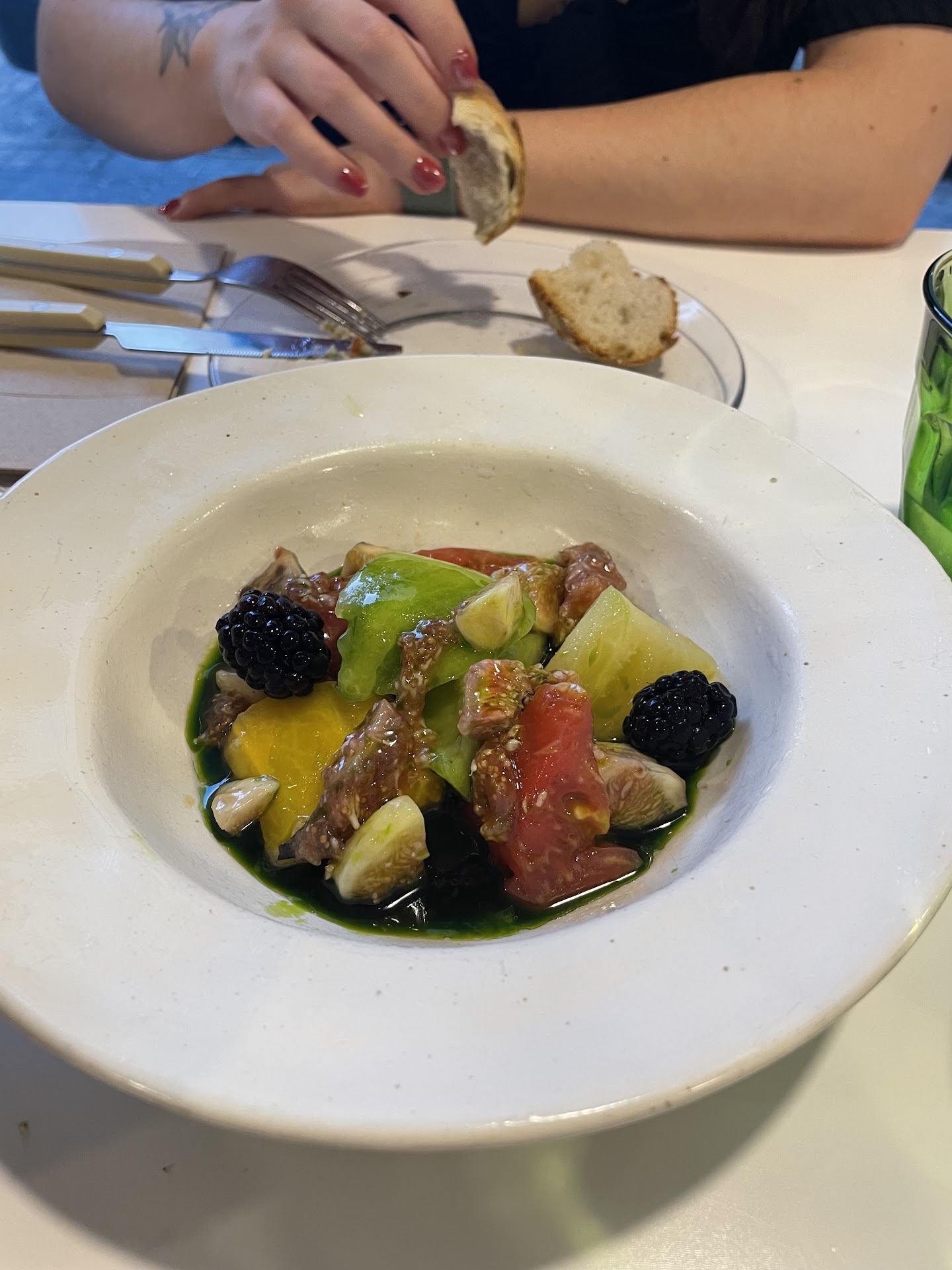 I went on a Thursday evening On arrival at 8:45pm it had the ambience of a canteen. The lighting was bright and white, not the setting for a romantic meal. The menu consisted of 12 non-descript items, including "greens", "beans", "cous-cous" and "breadcrumbs".