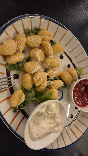 -Gnocchi Fritti.es una maravilla como entrante los ñokis con salsa trufada y salsa de tomate es una explosión de sabores.
