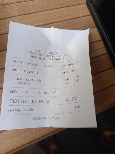 Read moreEn el caso de la flaca tengo dos opiniones... La primera: es una buena cafetería para parar en las salidas de ciclismo cafe rico pinchos muy buenos y siempre tienen detalles como mini croissant, frutos secos.... La segunda: hemos parado a tomar el vermú exactamente una Coca-Cola y una mahou no nos pusieron absolutamente nada de nada... cosa que al resto de mesas si... detalle muy feo por parte del camarero... Seguiré parando en salidas de bici como vermú...