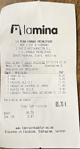 216,10€ gastamos en el restaurante de Lugones… Quiero decir con esto que en la Mina con sus precios, habríamos gastado en total, si “no nos hubieran echado”, cerca de 400€. Igual equivalía al ticket individual de casi 6 mesas… a lo mejor me equivoco pero no creo que ande muy desencaminado.
