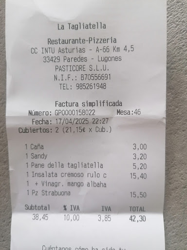 Read moreEste verano hemos ido mucho a la Tagliatella de la Zenia Boulevard y decidimos ir a este. Mi hijo se pidió lo de siempre: una pasta rellena con salsa 4 quesos y mi hija Tagliatelle a la carbonara. Cuando lo trajeron vimos que estaban complemente secos. Mi hijo se quejó, le dijimos a la camarera que, como podía observar estaban secos. Que por favor nos trajeran salsa. Vino la encargada y,a pesar de reconocer que estaban secos, nos dijo que nos cobraba la salsa. Ahora pienso que deberíamos haber devuelto el plato... En fin, como mi hijo no lo iba a comer sin salsa, le dijimos que vale. Después, mi marido y mi cuñado probaron la pasta de mi hija(nunca se queja porque apenas come) y dijeron que estaba aún más seca que la de mi hijo. Una carbonara incomestible. Hablamos con la encargada, le dijimos que eso no era normal, volvió a reconocer que quizás había quedado muy seca y le dijimos que no era normal que nos quisiera cobrar por una salsa que era inexistente en el plato. Ya mi marido, de paso, se quejó que en su pizza solo había 3 trozos de alcachofa... En fin, que cenamos fatal, nos trajeron la cuenta y nos cobran 6,8 € por una salsa que decía haber llevado la pasta!!. Les preguntamos que en qué parte de la carta estaba el coste tan bestial de la salsa y no existía!!!! Nos cobraron casi 7 pero viendo lo visto podían haber cobrado 10!!! Después de nuestra experiencia tan buena de la Tagliatella en la Zenia Boulevard, esta ha sido todo lo contrario. A este Tagliatella no volveremos nunca. En una de las fotos está la pasta sin salsa y al lado pasta con salsa, para que se...