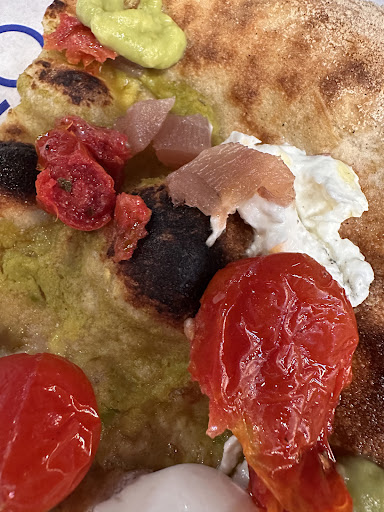 Nos atendió Jessica, muy atenta, y preocupada porque estuviéramos agusto. Camarera atenta, rápida y servicial. El resto del personal, digamos que les falta bastante entrenamiento. Olvidadizos y lentos. Personal ocioso cuando la camarera de comedor no da más porque lleva todo, atender y disculparse. La cocina, ya nos explicaron q eran nuevos, pero lentos, y lo peor de todo una ensalada de burrata hecha desde la mañana, con la lechuga medio pasada pero bien camuflada, y tomate ya medio reseco de la nevera. Jessica lo solucionó pidiendo disculpas q ni le tocaba dar. La pizza de aguacate, con base de aguacate? Guacamole de bote!!! Con trozos de mozzarella, y cherrys, los mismos ingredientes q la ensalada, y el tartar de atún, lo vio pasar, porque había muy muy poco. Podía ser una gran pizza de casi 14€, creo, y sinceramente, un mojón! A reseñar, las masas muy ricas. La cerveza italiana también. El local muy chulo. Pero recomendación, hay q ponerse las pilas con el perdón al y con algunos platos de la carta, porque sino no auguro buen futuro. No se puede dar una atención deficiente y un producto no a la altura del precio. Por cierto, el q ideó lo de pedir en mostrador, creo q no se ha dado cuenta de lo q ralentiza el servicio. Iría todo mucho más rápido con una comanda pedida en mesa, sin colas en caja (una caja lenta) y pagar la cuenta en la mesa. Suerte! Y a la camarera, tu puedes con eso y con más! Se te ve! En la foto la pizza de base de aguacate y...