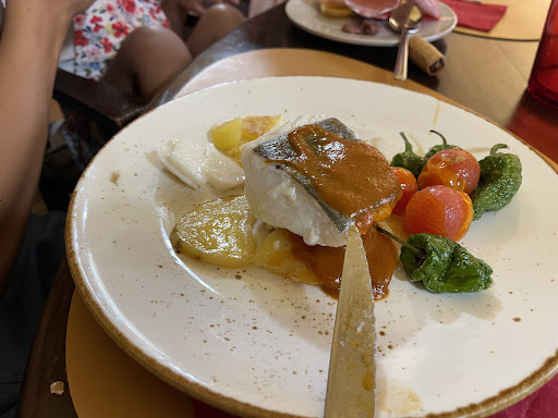 Tras indicarle al camarero el problema del pescado de que no tenía nada que ver con lo que se describe en la carta y que no podía comer ese tipo de comida, pone mala cara y se lo lleva sin decir nada.. al rato vuelve justificando que en cocina le han dicho que el pescado está al horno pero el cuerpo y la espina rebozado y frito (no tenía ningún aspecto de horno, ni costra como decía la carta ni nada). En lugar de ofrecer otra cosa por el cambio de lo reflejado en carta a lo traído a la mesa.. allí nos dejó el pescado.