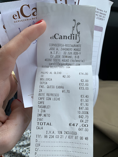 Read moreEl domingo 10-08-2025, fuimos al restaurante El Candil un grupo de entre 15 y 20 motoristas cada uno hizo su petición individual. En mi caso he pedí una lata de refresco y una porción de tortilla de patatas. No esperamos demasiado a que nos atendieran y sirvieran los pedidos, entre 12 y 27 minutos, todos estaba listo. He de destacar que el camarero fue muy amable y eficiente en conseguirnos sombrillas y colocarlas entre las mesas para que todo el grupo estuviera bajo sombra. Lo que no me convence es el precio por lo que he tomado (refresco y una porción de tortilla) que me han cobrado 10€ y que no estaría mal si la porción hubiese sido el doble de tamaño pues era bastante escasa. Al preguntarles porque no viene detallado el precio del refresco y la porción de tortilla en el ticket, la explicación que recibí es que se considera un almuerzo (una explicación absurda, sin coherencia) por esa regla de tres podían considerar un almuerzo un bocadillo con media pierna de cordero y está claro que el valor no es el mismo. Yo lo considero una mezquindad, yo no pedí almuerzo solo refresco y tapa. En fin no discutí y ya me sirve para otra vez descartar repetir la elección del Restaurante El Candil y dar esta opinión a cualquiera que le interese. No me hubiera importado pagar más por algo que lo vale (teniendo en cuenta que un restaurante no es una ONG, tiene gastos que cubrir y ha de tener ganancias pero acorde a lo que ofrece) en mi caso el precio estaba sobrevalorado descaradamente....