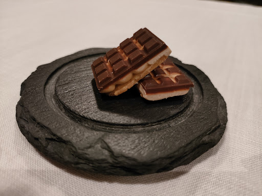 2️⃣ Ramen🍜 de sopa de ajo🧄 negro⚫️ manchego. Caldo ya huele a ajo negro, acompañado con angulas de monte, un huevo rebozado y al punto de coccion, el mejor. Setas top y caldo potentísimo. Top! 3️⃣ Ravioli de perdiz estofada a la toledana con cremoso de zanahoria🥕 y comino. Muy buen olor, cremoso, espectacular, salsa top, y ravioli, bien de trufa y no invasivo. Carne quizá un pelín seca. Un poco más de salsa, hubiera sido top top top 4️⃣ Menestra de verduras con praliné de cebolla🧅 y piñones. Praliné top, piñones bien, verduras crujientes y al punto, muy top, 5️⃣ Socarrat🥘 de careta de cerdo🐷 con carabineros🦐 y salsa brava🌶. Mmm, muy crujiente, salsa top, pero quizá un pelín más picante. Carabineros en su punto, regusto potente a pimentón. Espectacular. 6️⃣ Trucha🐟 en su jugo de berros y jamón ibérico. Mmm, la salsa gustor remanente que te sube por la nariz. Un punto perfecto de la trucha. 7️⃣ Pichón🐦 a la robata con milanesa de trigo negrillo. Tardó un poquito y llegó atemperao, que no frío, buena combinación del foie, uva para dar frescor, top. Carne muy muy buena y nada pesada 8️⃣ Manzana🍎 waldorf con helado🍦 de queso🧀. Pero esto qué es?!?. Nos encantó!. 9️⃣ Tubo de té🍵 con miel de la Alcarria, bola de helado de pan frito, espuma chocolate blanco. Teníamos muchas dudas por no ser fans de la miel y el té. Nos parecío muy top. La espuma con regusto a té y miel pero sin ser cansino. Olé! 🔟 Petit fours, Chocolate🍫 blanco⚪️, arroz inflado, menta, top! Chocolate🍫 negro⚫️ y polen Nube cereza