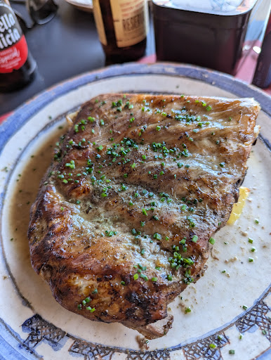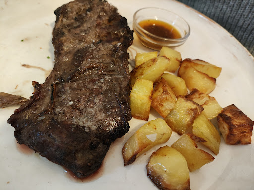 La carta se notaba que era casera y que cuidan los detalles. De primero, compartimos un provolone con tomate (rico, pero sin más). De segundo, comimos una entraña argentina que estaba espectacular, hacía mucho tiempo que no me la hacían con tanta exactitud al punto al que les había pedido. Y el otro segundo era una especie de panceta con carne y setas (no recuerdo el nombre del plato, pero estaba riquísimo).