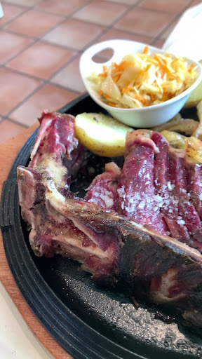 Read moreAmabilidad y simpatía desde la puerta de entrada. Muy a valorar que se permita entrar con el perro, que además fue muy bien recibida, perra, puesto que los propietarios habían tenido uno de esa misma raza. El olor a los asados y parrilla que salen de la cocina los deberían envasar como perfume. Local acogedor con cuidado en los detalles, amables y profesionales. Hay una parte del comedor en una terraza acristalada con buena vista hacia el valle. Elegimos uno de los menús de ensalada y chuleta para dos. La ensalada de pimientos y bonito nos gustó mucho, la carne que vino a continuación estaba muy tierna y sabrosa. Postres: una tarta de queso que se deshacía, exquisita, y una tarta de manzana que me encantó. Con ganas de volver para pedir otros platos diferentes, puesto que en la carta hay suficiente variedad para los que no sean demasiado carnívoros. Cuando pensé en hacer la foto ya casi nos habíamos terminado la chuleta 😄 Única sugerencia, muy particular, yo a una carne tan buena la pondría menos sal. Por cierto, el vino de ribera del menú...