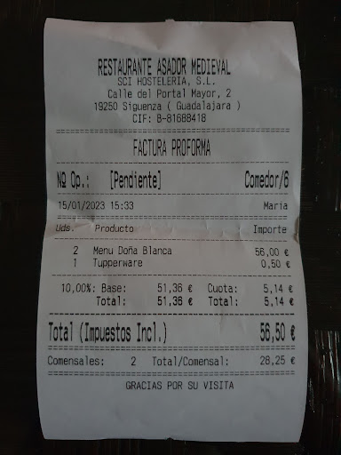 Read moreHe anulado mi reserva, porque aunque en Google Maps ponga que admiten perros, en realidad no es así. Me comentaron que mi perro podía entrar, pero en cuanto un cliente se quejase tendríamos que irnos sin rechistar. Que me parece bien, sí. Que podían actualizar la información de Google, también. Por cierto, Restaurantes en Sigüenza que de verdad admiten perros y en los que se come bien: "Soportales", "Rosetón" y "Boliche".