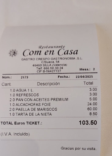 Read moreCom en Casa es un restaurante que aspira a la excelencia culinaria con platos que buscan acercarse a la calidad de una estrella Michelin. La comida es buena y la atención es correcta, pero lamentablemente no alcanza el nivel de un restaurante con estrella Michelin, especialmente considerando los precios elevados.