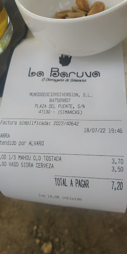 Read moreLo difícil es hacerlo mal! Un lugar con encanto esperas que esté a la altura los servicios que ofrece. Opinaré de manera objetiva, lo más objetiva que me deje el amargo sabor de la experiencia recibida. Pedimos una consumición para 2 personas en Baruva ( por cierto no me representa como imagen de BAR EN VALLADOLID) Nos dice el camarero 5€, hasta aquí todo correcto. Le pedimos el TIQUET Y PONE 4'5€ UHHHMM algo me he perdido! La conclusión es la siguiente: Este señor se queda el resto o la propiedad cobra lo que quiere. El uso de ticket y la entrega de el es obligatoria. Es una práctica habitual en el sector de no entregarlo. Seguimos.... la luz es pobre, tan pobre que alguna de las líneas se cae y te quedas a media vela! No es que sea un problema es que es altamente peligroso para la seguridad de los clientes REVÍSELO CON SU EMPRESA DE RIESGOS LABORALES. Lo que más valoramos los clientes en el gusto que te deja el final y está guinda no colma es precioso pastel que tiene al lado de esta terraza. Si desea reopinar la propiedad me encantaría atenderles....