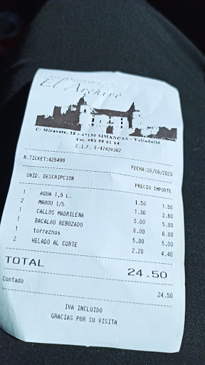 Read moreEl Bar está bien ubicado, a la entrada de Simancas, frente al Archivo, con plazas de aparcamiento cerca. El local es amplio y correcto, y en buen estado aparente de higiene. En la barra hay una buena variedad de cosas para picar. El ambiente, el típico de un bar de pueblo, eminentemente tranquilo, aunque me llamó la atención que el comedor estaba aparentemente vacío, y eran las 3 de la tarde. Lo peor, el servicio. Atendido en barra por una persona de edad respetable. Un poco de amabilidad y simpatía sería bien agradecida. No...