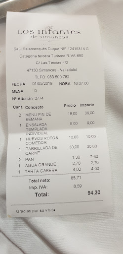 Read moreME CONVENCE LA RESPUESTA DE LOS DUEÑOS, EDITO Y MEJORO LA PUNTUACIÓN. Me desvié de la A6 para comer, tenían buena puntuación en Google. Hay que callejear con el coche por Simancas para llegar. Comedor bien decorado aunque un poco para el turista, bonito patio interior y aseos cuidados. Menú del día por 14 euros con mal comienzo, cuando te ofrecen de primero macarrones, ensaladilla o melón con jamón piensas: aquí hay poco cariño, ¿qué les cuesta hacer una buena sopa castellana con huevo o un rico plato de cuchara?. La cerveza del menú más bien cañita, tampoco cuesta poner un tercio, digo yo. La cosa mejoró con unos calamares en tinta con arroz ricos y bien cuidados, y buena también y casera la panacotta de postre. El café detalle de la casa. En fin, no estuvo mal pero el menú mejoraría mucho con...