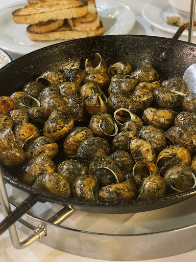 We ordered - starter of prawns - 10/12 starter of snails - 20 maybe! starter of fried potatoes - 3 large handfuls beef tartar - a small mountain 500g veal steak - good and thick