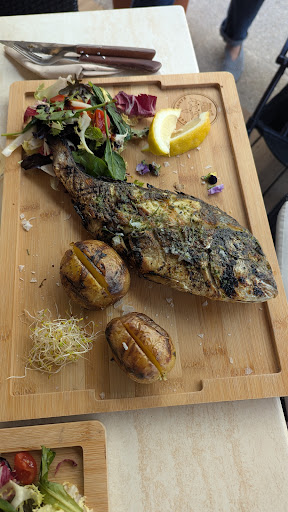 For starters, we had patatas bravas, gambas al ajillo, and pimientos with feta cheese. For the main course, we chose the sea bream (dorade) and bifteki. Every single dish was just wow — full of flavor and very well prepared.