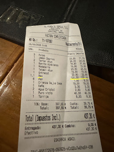 Read moreTourists, beware — we were scammed. We visited this restaurant twice. The first time, the food was genuinely good, so we decided to return. Big mistake. We ordered the “fish of the day” 8with no price indication). It was brought out already portioned across two plates, with a third plate showing just the bones. We never saw the whole fish, and something felt off. Then came the bill: €130 for just the fish (see picture) It was outrageous. We suspect they overcharged us simply because we were tourists — likely three times what a local would pay — and it's possible the rest of the fish was served to other guests. Yes, the food is ok, but the experience left a really bad taste. Dishonest and disappointing behavior. We paid, but we want to warn others: think twice before...