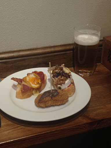 Read moreHicimos una parada "rápida" (35min) a tomar una caña tras un largo viaje. En lo positivo: El sitio es bonito y acogedor, con iluminación "ambiente" y buena climatización. La localización muy buena y fácil de encontrar. En lo negativo: Había mucha gente (Lo cual me dijeron que suele ser lo normal) y era "incómodo" para hablar. La cerveza muy poco fría. Casi diría que del tiempo. Las tapas normalitas. Probamos la croqueta de setas (u hongos, o no recuerdo como las llamaron) y siendo como soy una fan de las setas, me quedé un poco decepcionada. Mucho olor (¿a trufa?) y poco sabor. Interior un tanto seco y demasiada predominancia del sabor del rebozado. Eso si, el poquito de salsa por encima, bastante más sabroso. La tosta con huevito y beacon , correcta. Y la de queso con frutos secos y pasas también bien (pero esto hay que reconocer, que mérito de cocina no tiene que son todo cosas crudas) Del precio no puedo decir nada porque no tengo ni idea de cuanto costó, ya que pagó...