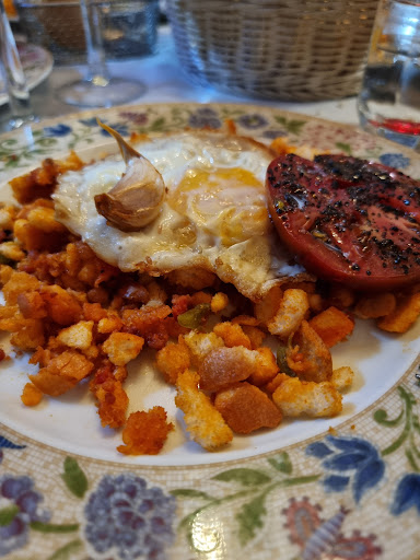 Me recomendaron este sitio, y la verdad que es para no volver. Quizás mi experiencia no fue grata por la comida, no tenían de nada....me parece perfecto que sea domingo, pero deberían de tener como todo bar/restaurante provisiones, comida,,,para eso es un servicio que ofrece. Llamamos sobre las 21:50 para reservar. Llegamos al restaurante y los primero que nos dicen es QUE CIERRAN A LAS 11 las cocinas ( eran las 22:35) nos ponemos rápido a decir lo que queríamos pedir para no hacerles demorar más. Queríamos chuletón trinchado para compartir, pues bien, no tenían ningún tipo de carne!! Nada! Ni hamburguesa, ni morcilla, ni chorizo,,, ya no hablamos de las tostas. Cualquier cosa que queríamos de comer, no tenían, así que les dejamos a ellos que nos dijeran que tenían en cocina para comer, ya que de todo lo que queríamos no había nada. Nos tuvimos que comer lo que les había sobrado básicamente, nos hicieron ellos la "cena" por así decirlo. Eran unas Migas ( secas, sin sabor... Fatal) , unas patatas revolconas, las cuales solo sabían a pimentón, unas croquetas, venían 5 ( se salvaron gracias a Dios estaban buenas, lo malo... servidas en una cestita de freidora pero sin un plato .. un papelito que cubra... Algo por higiene...)y ya para colmo nos ofrecen una degustación que les había sobrado de oreja, que pinta de oreja no tenía , estaba quemado, medio crudo ... Tenían mala pinta, malísimas. La pena que no hice fotos (pero de las migas y las revolvonas hay en otros comentarios). Nos quedamos con hambre, fue una situación subrealista.... Punto 1, si llamo para comer ( ya que es un restaurante) quiero comer y si no hay comida, por teléfono tener el detalle de decírmelo y me voy a otro lado. Punto 2, ya que no hay comida una vez sentados en la mesa, ofrecer o poner en el plato una cantidad algo mayor, ya que nos estamos comiendo las sobras y lo que quedaba del día, massss lo que en la cocina quedaba. Punto 3, reciclar al cocinero/a por mejorar la calidad de comida, porque las cosas se pueden hacer mucho mejor. Punto 4, con respecto al personal, incentivarles con algo, para que tengan una carita más alegre. Ponerles uniforme (opiniones) que no te atiendan con un cigarro en la mano... Punto 5, esa fue nuestra experiencia,,,y no tenemos un paladar fino precisamente. Gracias, al menos nos reímos de la situación... Pero, mejorar ciertas cositas que no cuestan tanto. Como el tener comida en un restaurante y no poner excusas de que ha habido mucha gente anteriormente en el día y se os ha gastado de todo o quizás que no os apetecía...