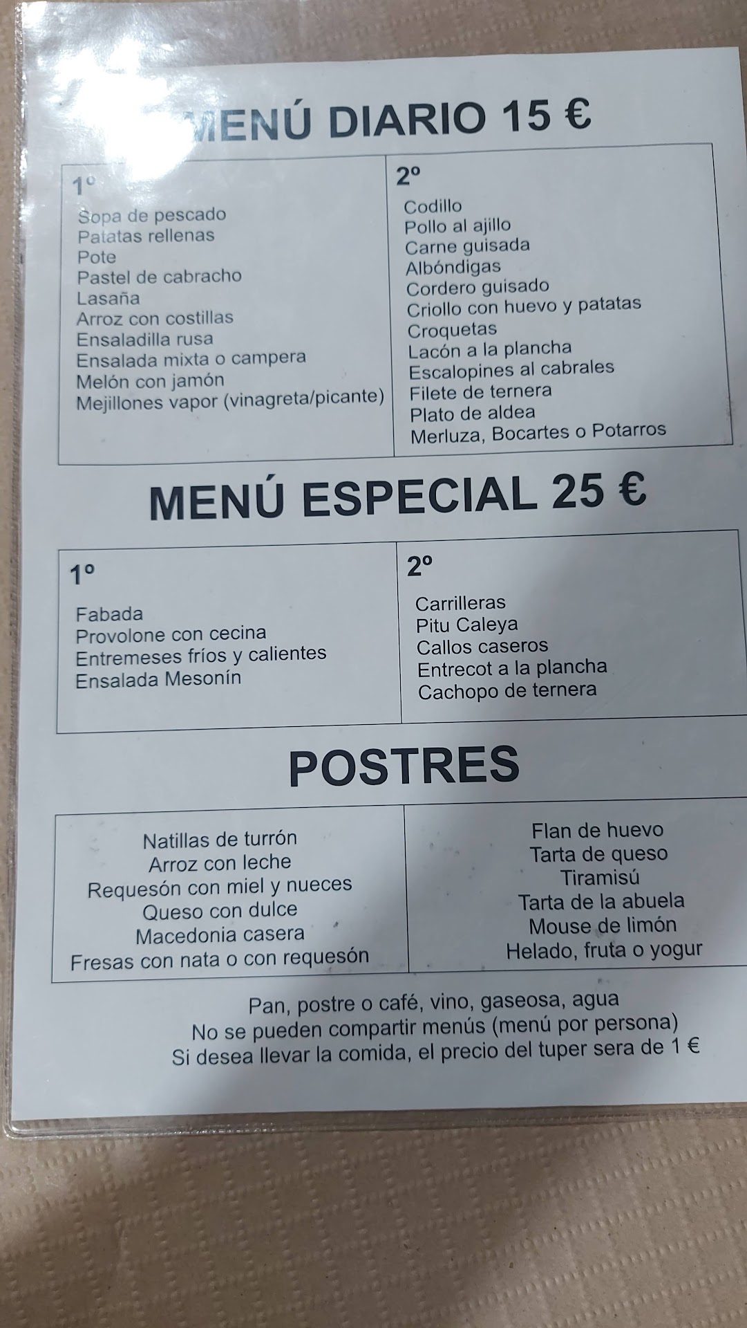 Read morePrevia reserva realizada hace más de una semana llegamos antes de la hora a comer por lo que nos tomamos unos vinos en la barra para esperar a que los comensales que estaban comiendo en ese momento pudieran finalizar tranquilamente. A la hora prevista nos acompañan amablemente a la mesa Al ser festivo el menú tiene precio único de 25€ siendo variado para satisfacer a cualquiera. Pedimos sopa pescado, patatas rellenas, pote y de segundos cachopos, escalopines al cabrales, plato de la abuela y de postres fresas con requeson, requeson con miel y nueces, etc. Unos cafés y a pagar... Mayo 2025 Llamamos antes de ir por si no hubiera sitio y nos dicen que sin problema por lo que llegamos a las 15h colo comentamos, tras una espera de 5 minutos nos acompañan a la mesa, Pedimos de entrada una ensalada mixta para cada uno (con una para los dos valdria), codillo y cabrito (muy rico) Un mousse de limón y tarta de la abuela antes de los cafés. El menú a 15€ más los ☕️ Agosto 2025 Miércoles y con reservas previa ya que están al 100% . Todo el personal te atiende con amabilidad a pesar del trabajo que tienen. Llegamos a la hora prevista y tras una pequeña espera por la mesa nos acompaña Letty donde ya nos espera la bebida, agua, vino y gaseosa. Nos atiende Alba y pedimos ensalada, pote y mejillones (podría ser para dos comensales) y de segundo codillo y escalopines al cabrales . De postre arroz con leche y mousse de limón.. ... Como siempre con una...