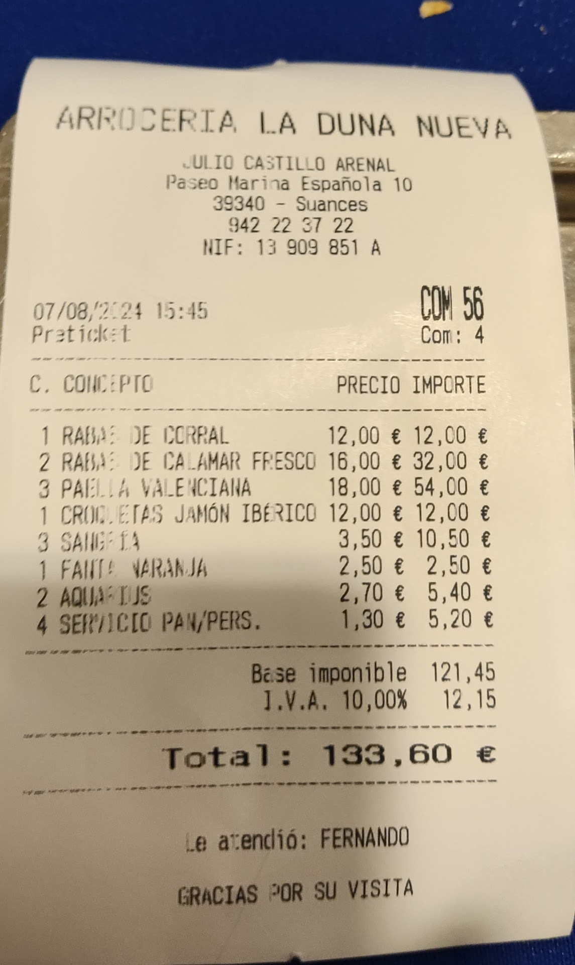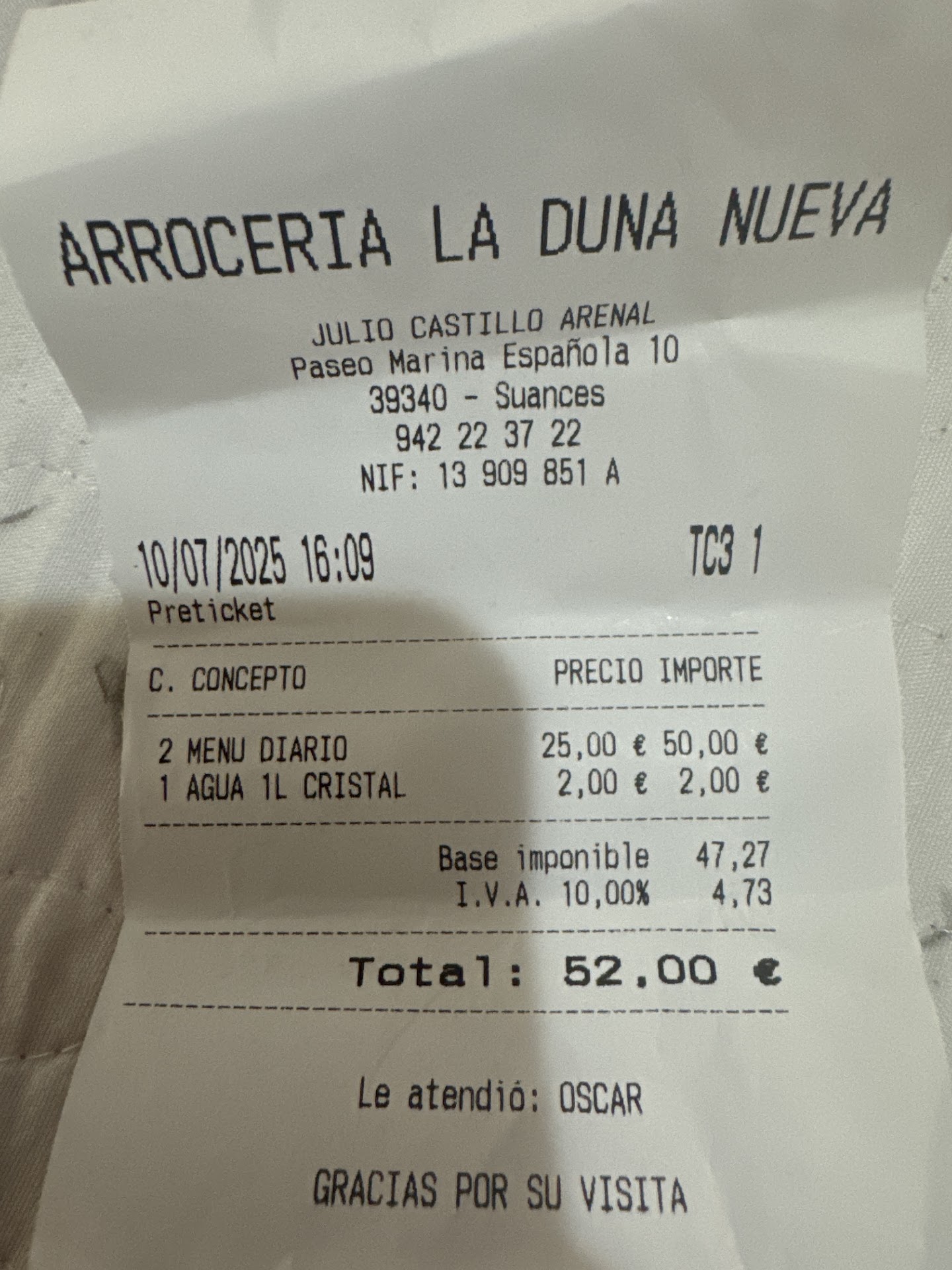Vamos con lo peor que hemos comido en mucho, muchísimo tiempo. Éramos 5, y de verdad, decepción absoluta el arroz "La Duna". No sabía literalmente a nada, como masticar agua. Ni con sal hemos podido arreglar semejante destrozo. 95 eurazos de "paella" que no sabían a nada. No hemos querido ni postre. Por favor, como reseña constructiva, que se revise todo el género de arriba a abajo, la calidad y tambien ya de paso el tiempo de atención, por que el precio creo que es suficiente para exigir...