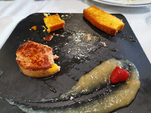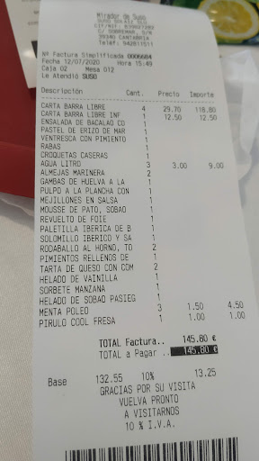 Plato por plato: Anchoas: un imprescindible estando en Cantabria. Muy alta calidad, anchoas sin una sola espina, sabor increíble. Gambas a la plancha: imprescindible, se nota que son de muy buena calidad y frescas. Cecina: nos sorprendió, la cecina tenía muy buen sabor y con el queso parmesano por encima mejoraba mucho. No es un imprescindible, si no eres de buen comer resérvate para los siguientes. Foie de pato con compota de pera y sobao: es un imprescindible de la carta. El foie era muy fresco y estaba muy bueno, y la combinación con la compota de pera resaltaban los sabores. El sobao era incomible, estaba completamente seco y duro. Hubiera sido muchísimo mejor algún tipo de pan tostado o similar. Almejas en salsa: muy frescas, buen sabor, la salsa perfecta. Calamares: buenisimos, caseros y recién hechos. Blandos por dentro, crujiente por fuera. Muy buena presentación. Pimientos rellenos de marisco: plato bastante contundente, los pimientos grandes y bien rellenos. El relleno de marisco es una pasta con sabor a marisco pero tiene muy buen sabor. La salsa que los acompaña más q aceptable. Zamburiñas en vinagreta: prescindible, la vinagreta echa a perder la zamburiña. Las zamburiñas estarían mejor simplemente a la plancha. Merluza rellena de marisco: estaba completamente cruda por dentro, está rellena con el mismo relleno de marisco de los pimientos. No recomiendo. Cochinillo a baja temperatura con patatas: no recomiendo, estaba frío y bastante insípido y seco. Las patatas panaderas que acompañaban debían tener varios días, secas y con sabor a vinagre. Secreto con patatas panaderas y piña: el secreto aceptable, un poco seco. Las patatas panaderas eran las mismas que las del cochinillo, secas y son sabor a vinagre. La piña estaba buena. Tarta de queso: es casera. Un detalle importante es que te preguntan si quieres mermelada por encima o no. El problema es que no es mermelada es el típico sirope de fresa que estropea la tarta.