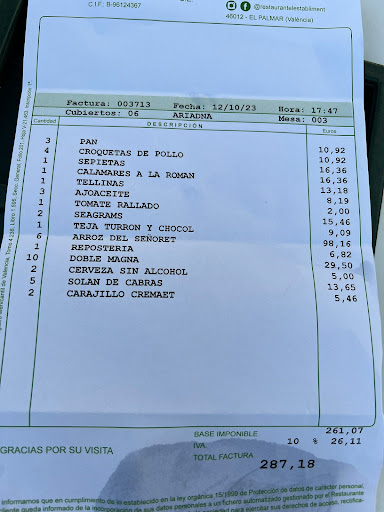 Fuimos a comer 5 adultos y 3 niños (dos de 3 años y uno de 5). Como dos personas se iba a retrasar, preferimos pedirle algo a los niños para que fueran comiendo. De la carta lo único factible para ellos eran croquetas y calamares, ya que no tienen raciones de arroz sueltas. Esto es lo que nos aconsejó el primer camarero que nos atendió, no había opción de algo más concreto para niños. De entrantes, para los adultos pedimos: sepionet en su tinta y tellinas. Además de pan con alioli y tomate. De esto pedimos un par de veces debido a que las raciones eran pequeñas, muy pequeñas. El sabor de los entrantes muy bueno, pero cuando te toca pedir pan varias veces, es síntoma de que te quedas con hambre, pues como digo, las raciones eran pequeñas. De principal arroz del senyoret, muy bueno de sabor. En ppio era para 6, pero fallaron dos personas. Cuando les pedimos de hacerla para 4, nos dijeron que no porque el sofrito ya estaba hecho, cosa entendible. La verdad es que nos vino bien porque nos lo comimos todo (como nos habíamos quedado con hambre). Otra cosa muy a mejorar es la rapidez a la hora de sacar los platos. Tardaron muchísimo entre plato y plato. No sé a qué se debía, fuera por lo que fuera tampoco nos dieron razón o explicación. Esto no solo era nuestro sentir, ya que lo comentamos con la mesa de al lado. La atención de la camarera que nos atendió fue exquisito y cercano. Postres pedimos dos a compartir: teja de turrón y chocolate y una mousse de chocolate. Estaban buenos. Finalmente pedimos dos cremaets y dos gintonics. Precio total 287,18€. Mi opinión, es que lo veo caro para la cantidad de comida de los platos. Ah, otro detalle que me gusta mucho en los restaurantes es que te inviten a algún tipo de digestivo. Aquí no lo hubo, pero bueno, es un mal menor. Un detalle que tampoco sea tan importa, pero me gusta siempre decirlo en mis comentarios. Ya que favorece las buenas sensaciones antes de irte. Sí que entraba un pequeño puré de cortesía al principio.