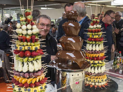 Ahir en el Restaurant el Gat del Rosal ens vam reunir 71 exalumnes dels Escolapis de Tàrrega per tal de fer-hi l'àpat de germanor. En aquest espai ampli i lluminós que es va reservar només per al nostre grup, ens vam distribuir en còmodes taules rodones de deu comensals. Vam tenir una variada oferta de menú tot i la collada que érem sent un dels al·licients el primer plat de bufet lliure variadíssim per muntar-te tu mateix el combinat que et vingués de gust: fideuà en una gran paella, amanida variada, saltejat de bolets, vasos de pebrot del piquillo amb brandada de bacallà...fins al punt que alguns companys comentaven que amb aquest bufet es podia pràcticament tancar el dinar. En el segon plat vam poder escollir carn o peix i també hi havia prevista ofeta vegetariana, tot molt correcte. Però va ser en els postres on es van oferir el plat estrella, quan a part d'un got de iogurt amb una mena de melmelada deliciosa, se'n va presentar dos cons enormes farcits en tota la seva superfície per talls de fruita variada en pintxo (veure fotos) que un cop desclavats es podien amarar de xocolata desfeta que rajava per una font...Els comensals ens podiem servir així pintxos de mandarina, de raïm morat gruixut, d'uns artístics talls de meló en forma d'ales, de cubets de pinya, etc. La fruita en el seu just punt de maduresa i la xocolata que la cobria formaven una dupla deliciosament apetitosa...Si a aquesta suggerent varietat i riquesa culinaria hi sumem un servei esmerat compredrem perquè aques establiment té l'èxit que té. Per a mi aquest postre que ningú va deixar de servir-se i de repetir en molts casos, va ser un plus d'alt valor realment sorprenent i espectacular ja que a les qualitats de sabor s'hi sumava un regal estètic de formes i colors...i ja sabem que manta vegades, en matèria culinària, per la vista pot entrar o no un plat... Tambe vam disposar de servei de megafonia i projecció d'imatges en una pantalla ( no cal dir que amb perfecta connexió a Internet!) Per tant vaig pagar ben a gust els 27 € per cap que se'ns demanava...i vaig quedar altament satisfet. Ah! Se m'oblidava: en termes de neteja tot, absolutament tot, brillant...