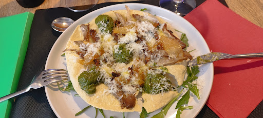 Edito reseña para contestar al propietario: Es evidente que no estoy de acuerdo, pero bueno, los precios los pone el dueño y en su derecho está. La pizza no es que viniera fría, es que estaba totalmente fría, (de hecho estaba tan fría que pensé que era así, por eso no dije nada), no había estado caliente, no sé si me explico. Lo de no tener la carta en castellano, pienso lo mismo, sin entrar en politiqueos, y desde el respeto,, se trata de facilitar las cosas en un lugar en el que se hablan los dos idiomas. Otra cosa importante, he leído las contestaciones a las reseñas negativas y me parece que podrían hacerse de un modo más... didáctico, sin entrar en insultos, si uno se siente insultado, insultar, sobre todo de cara al público, no es la mejor opción, es mi humilde opinión que trabajo de cara al publico desde hace 30 años. No obstante, sigo recomendando visitar el restaurante porque la comida es buena. Saludos al restaurante. Le doy tres estrellas porque considero que tiene cosas que mejorar. En general nos ha gustado, pero considero que los precios son elevados, sobre todo para la cantidad servida. LA FOTO que pongo se supone que es una pizza, quizá al pedir la pizza el personal debe advertir que es una pizza "peculiar", de hecho, bajo mi punto de vista no es una pizza, la pizza es otra cosa. El sabor era bueno, pero además es fría y pequeña. El postre tipo "tarta de queso" es espectacular, de lo mejor que he probado, y el postre de chocolate tanbien. El espacio es original, nos ha gustado bastante. Repito, creo que el principal problema de aquí son los precios. El personal es amable. Otra cosa, creo que la carta debería estar también en castellano, cierto que estamos en Cataluña, pero... sí se puede ¿no es mejor facilitar la atención al cliente?... Esto sin acritud y sin querer entrar en absurdas polémicas idiomáticas, pero teniendo en cuenta que irán clientes de allí y el resto de España no estaría mal y es una deferencia al resto de clientes, tener que estar preguntando lo que significan algunos ingredientes es incómodo para el cliente y poco operativo para el...