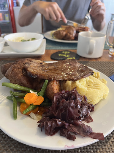 We visited the Devon Restaurant and Bar twice whilst visiting Lanzarote. My wife and I love eating a variety of cuisines, but we really fancied a Sunday roast for a change. We were able to book by WhatsApp which was definitely worthwhile as it does get busy. The staff are superb, very welcoming and able to cater for any special requests attentively which we noticed being done for particularly some of the older clientele. There is an extensive selection available for Sunday roast, with Turkey, Gammon, Lamb, Pork or Beef available, served with roast and mash potatos, a huge Yorkshire Pudding, braised cabbage, stuffing and gravy, with a selection of vegetables on the side and the truly epic cheesy leeks as well. You can double up on meat, and also get extra cheesy leeks or vegetables for a small additional fee. The meat is beautifully cooked, being moist and tender - between us we tried all of the meat selection and all was nicely cooked. For picky kids, a selection of reassuring beige is available which is a massive stress reducer. A selection of cocktails, wines, beers and soft drinks is available, I can definitely say that roast dinner and a Pina Colada is a great combination. For those who have a super hunger, a variety of puddings are available, including brownies, cheesecakes and crumbles, all of which are served with a choice of ice cream, cream or custard. On our second visit I starved myself for a couple of days beforehand and was therefore able to enjoy the Apple Crumble and hot custard which is as enjoyable in 31°C heat as it is in the depths of an English Winter. The view is lovely with the sea visible from inside and I would definitely recommend to others. There are a range of excellent dishes available on other nights such as Steak night Tuesdays and Fish and Chip Fridays. We will be back again. Thanks to all the team for such a lovely experience especially Graeme and Emily...