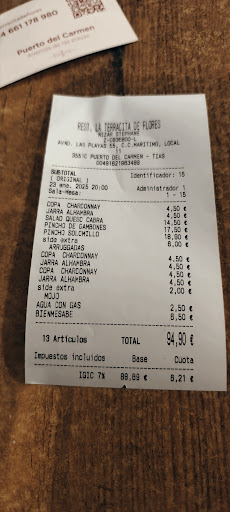 Read moreWhat a truly fantastic experience at La Terracita De Flores. On the night that we went, there was just the chef, Nizar, and 1 front of house, and a full busy restaurant. The service was fantastic. Even though it was busy, nothing was too much, and we were truly looked after. And the food, well, it speaks for itself. No frills or pretence, just excellent local ingredients, cooked perfectly. We were so impressed with how the chef, operating alone, was able to produce food for the whole restaurant by himself, without sacrificing any quality. It was truly delicious, highlights being the tuna and filet mignon skewers. But honestly, anything you order here would be delicious. It is a restaurant that oozes quality. The setting is great too, with a few outdoor tables under a cover with little ambient lights. Truly magical evening. Nizar, thank you again, you are a wonderful chef, and you have a wonderful restaurant. We have been coming to PDC for many years, and after trying this place, we will be back here every time we return. Really looking forward to eating here again. In short - try this place. The reviews don’t lie, and you are guaranteed to have a...