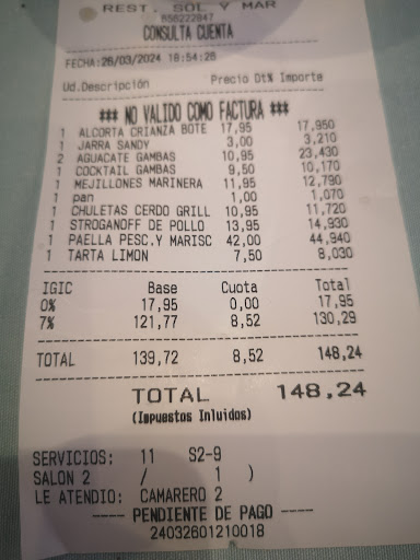 Read moreIf you are staying in this area and looking for a restaurant for dinner give Sol y Mar a try. We did and were very happy with our choice. A party of four we had four different starters and main courses and all of us were more than pleased with the quality of the food and how well it had been prepared and presented. We will be making a return visit.
