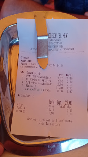 Read moreFuimos a comer el día de las madres, teníamos reserva. Al llegar nos sentaron bastante pronto. Las bebidas llegaron relativamente rápido, pero el servicio de pan no estaba completo, porque les faltaban mantequillas, que supieron con alioli de cangrejo, que no todos comen. Pedimos ensalada, papas bravas, 1/2 de bacalao encebollado y dijeron que trajeron una y eso cobraron, champiñones rebosados, lágrimas de pollo, a las que pusieron 4 papas y cobraron aparte (3€ cada plato), papas bravas, que pa mi gusto fue lo mejor, y huevos rotos. El momento de la cuenta fue un desastre, el ordenador no funcionaba y vinieron dos veces a la mesa para que les contáramos qué habíamos comido. La verdad es que no sé si volveré, quizá vuelva para ver si la experiencia no fue perfecta por falta de personal y productos o es que la cosa es así. Los camareros muy muy...