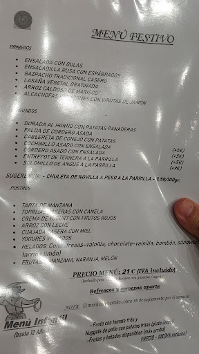 10-2023 Paramos a comer aquí 8 personas previa reserva. Disponen de menú (como es festivo por 21€ aunque algunos platos tienen suplemento de 5€), con 6 primeros para elegir, 7 segundos y 8 poatres diferentes. Nosotros pedimos: Lasaña vegetal gratinada. Servida en una sartén bien calentita. Estaba buena. Corazones de alcachofas con virutas de jamón. Estaban tiernas y muy buenas.