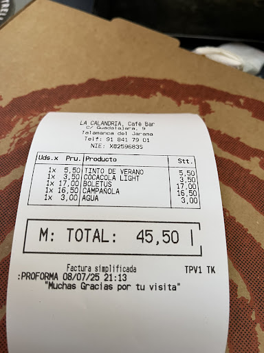 Read moreMi Noche de Terror Culinario Para empezar, esa pizza… ¡qué insulto! ¿Masa congelada? ¿Y encima cruda? Si vas a poner pizza en tu menú, lo mínimo es hacer tu propia masa, ¡no sacar un cartón del congelador! Y luego, los ingredientes: boletus de lata (¿en serio?), queso sin sabor del más barato y un tomate que parecía recién salido de la lata, sin ninguna preparación. El conjunto era un claro ejemplo de cómo NO hacer una pizza. Sentí que me estaban tomando el pelo. El Atraco de la Cuenta Pero la comida fue solo el principio de mi indignación. Cuando llegó la cuenta…¿5,50€ por un tinto de verano mientras una copa de Rioja cuesta menos? ¡Eso es sencillamente ridículo! Y luego, una botella de agua pequeña por 3€. A ver, si vendes algo que has elaborado, ponle el precio que quieras, pero comprar una botella de agua por 20 céntimos y cobrarla a 3€…No tiene ningún sentido. Sentí que me estaban robando a mano armada. Y por si fuera poco, el lugar era un horno. ¡Por favor, poned un ventilador al menos! Entre la pésima comida, los precios desorbitados sin justificación y el ambiente bochornoso, mi paciencia llegó al límite. Nos tuvimos que ir, nos metieron las pizzas en una caja que después tiramos…Este restaurante no merece ni una sola visita. Mi consejo es claro: ahorra tu dinero y...