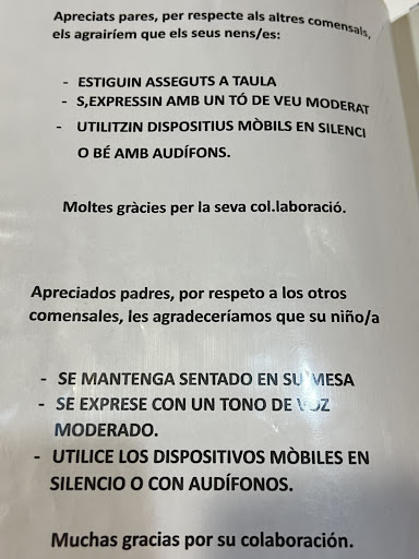 No tenen cap mena d'empatia i pel que sembla per a ells els infants no són persones. Al costat teníem a una persona adulta que parlava cridant tota l'estona i no parava de mirar vídeos amb el mòbil amb el volum ben alt, però sembla que això no arribava a la cuina, hi ha un filtre on només arriben les veus dels infants. El pitjor és que no hem sigut els únics, abans de marxar ja estaven fent callar a uns nens d'una altra taula on simplement estaven xerrant.