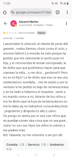 Read moreMe gustaba el kfc. Pollo frito empanado como en el sur de los.uu..pero de ese pollo solo queda la nostalgia. En fin que no aprendo .aparte de que ya no puedes pedir al personal de tienda .(tienes que elegir en unas maquinas miy chulas) optó por la opción de pagar en caja y así poder hablar con alguien y expresar mi inquietud..le dije a un responsable una vez que por que solo p9nian pechugas ? Me comentó muy amablemente que cuando pidiera en casa se lo dijera al encargado de mi pedido y harían todo lo posible por que llevara lo que pedía.le agradeci. De eso hacen alrededor de 8'o9 años. Hoy en la sucursal de talavera a la1 voy y hago el pedido como d3 costumbre y me dice el encargado que tengo que pagar aparte. Y le pregunto si pone n 2 alas 2 tiras y un muslo por que me tienen que dar pechuga. Que si quiero otra cosa que tengo que pagar. Perdón? No estoy pagando por lo que he pedido?es como si compro una casa tenga que comprar la 2da.para tener cocina.claro sin políticas de la empresa según el encargado yyo Ajo y agüita... ya se donde no volveré en...