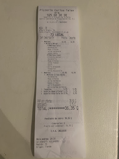 Read moreEsta noche fuimos mi pareja y yo a cenar a Pizzería Carlos (Talavera) con la intención de aprovechar la promo 2x1 en pizzas medianas que anuncian en su web. Ya habíamos ido hace un mes y, pidiendo lo mismo, sí que nos la aplicaron sin problema.