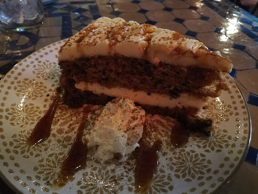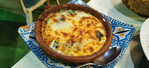 Pedimos una crema de setas gratinadas con caramelo, con ese contraste muy bien logrado entre lo salado y lo dulce, que sin yo ser un gran aficionado a esta mezcla, me pareció muy buena y muy equilibrada. También fuimos a lo seguro pidiendo tajín de espinacas gratinadas con queso mozzarella, que ahí sabía que acertaba seguro, y así fue. Plato de barro, con mucho queso y muchas espinacas, contundente y muy rico.