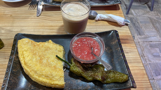 La comida está muy bien, para los carnívoros hay una hamburguesa a compartir entre cuatro que esta muy bien. También los huevos rotos. Patatas de las de verdad. Muy amables. La terraza hay que reformarla y ponerle un suelo porque es muy incómodo comer con la mesa inclinada. Por lo...