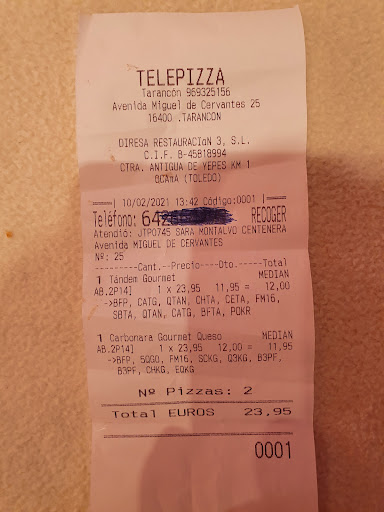 Read moreFui un domingo por la noche a por unas pizzas para la familia( los domingos por la noches son noches de pizza), y me dice la que estaba atendiendo, " perdona, nos hemos quedado sin jamón de york". Contesté: no se preocupe, elijo otra. Y me dice: " resulta que tampoco tenemos peperoni". Vaya vergüenza. Y el gerente de ese telepizza? No hace su trabajo? Total, que me fui y les dije que cerraran ya..... Si yo soy el gerente de ese telepizza, voy al chino 24 h y compro jamón york para sacar la noche adelante. Que se quede sin jamón la pizzeria Pepito, pues bueno. Pero que le pase esto al telepizza......Y sin peperoni.........