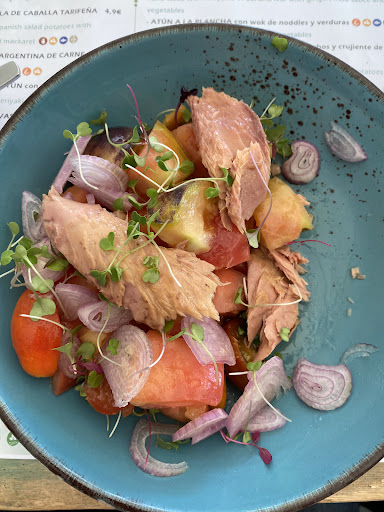 La tosta de sardina ahumada con salmorejo de albahaca y queso payoyo, sin palabras. Coincidimos los dos ( que estuve comiendo con un amigo) en que nos hubiéramos comido, dos, cuatro o dieciséis tostas...una sinfonía de sabores exquisita. Además lo equilibrado que estaba todo. Se notaba el salmorejo, la suavidad del queso, el toque ahumado de la sardina, buenísima!!!!!! Bravo.