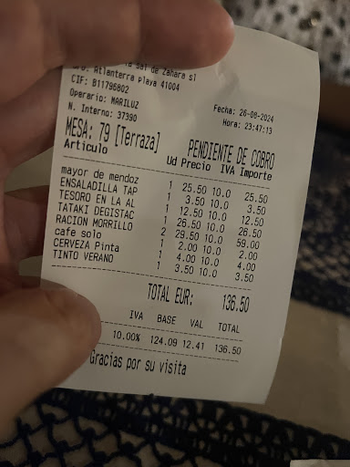 Read moreLlevamos veraneando en Atlanterra más de 5 años y siempre vamos un par de veces durante las vacaciones al restaurante. El año pasado tuvimos una mala experiencia en cuanto a varios platos, el risoto de ortiguillas no fue como el de otros años, y la tapa de atún en tempura se la sirvieron a un comensal congelada, lo dijo a la cocina, se la llevaron y la volvieron a traer fría. Este año decidimos darle una oportunidad después del año pasado y en cuanto al servicio me gustaría comentar que el trato de la camarera no nos pareció adecuado para un restaurante de esa calidad. Nunca hemos tenido una experiencia así en vuestros restaurante, siempre era el servicio encantador y durante la cena hubo varios gestos que no nos gustaron. Nos quitaban los platos sin que hubiéramos terminado, además nos dijo que no había 3 tapas ( tesoros de la almadraba, #tdeatun y otra, no nos explicó ninguna de las tapas como siempre han hecho (la tempura nos la sirvieron en una fuente las 6 tapas a diferencia de otros años que cada uno tenía su tapa en su plato, al igual que la mcdraba que nos pusieron 2 y 3 tapas juntas). Para nuestra sorpresa cuando estabamos saliendo del restaurante vimos salir un plato de la tapa tesoros que nos habían dicho que no había. Preguntamos en la barra y nos dijeron que es que habia todas las tapas por lo que no entendemos porque nos dijeron que no había 3 de ellas. La de este año ni nos la ofrecieron. La comida muy buena como siempre y de muy buena calidad, aunque hemos notado que las raciones han disminuido pero recalcar que el servicio este año nos ha decepcionado bastante. En definitiva recomiendo ir a la parte de fuera a tapear o picar algo en vez de ir al...