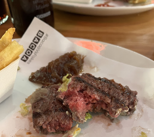 Mi pareja se pidió la hamburguesa “New Clasica” y yo la “Manchega”. Cuando llegaron, ambas tenían buena presentación, visiblemente comestibles. La hamburgesa “Manchega” lleva cebolla caramelizada, me llamó la atención por este detalle, pero al igual que con los nachos, estaba helada. Ni siquiera hicieron el esfuerzo de calentarla. Además, cuando ya llevaba la mitad de mi hamburguesa, me dió por mirar la carne y esta estaba cruda. Saqué la carne de la hamburguesa y la empecé a partir: el exterior estaba cocinado al igual que los bordes pero el interior estaba crudo. Me acabé comiendo la hamburguesa dejando solo los laterales de esta y el centro lo dejé en el plato (adjunto imagen). Después de ese disgusto, mi pareja contempló su hamburguesa y era lo mismo, tanto los bordes como el exterior estaban cocinados pero el interior crudo.
