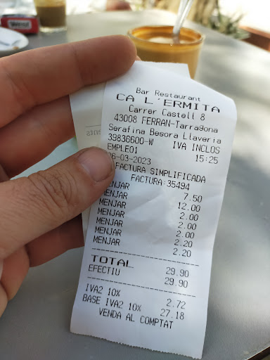 Read moreAyer un grupo de 14 personas comimos en Ca L'ermita. A este pequeño restaurante no le falta de nada. Tomamos el menú de fin de semana, La mayoría pedimos calçots de primer planto que nos los sirvieron con abundancia, igual pasó con la sabrosa salsa que los acompañaba. De segundos nos encontramos con unos excelentes guisos caseros y una gran variedad de carnes a la brasa. Nuestras peticiones fueron muy variadas y todos quedamos muy satisfechos. Los postres, también caseros, estaban buenísimos. Fuimos atendidos con muchísima amabilidad, rapidez y eficacia. Muchas gracias a Karen y a las otras personas que nos atendieron. Para finalizar diré que es un restaurante sin lujos, pero con todas las comodidades y la calidad necesaria para disfrutar de una buena comida. La relación...