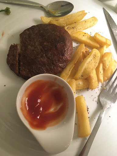 Well after finishing our first course we received our second course.... which was epically bad. My partner ordered the hamburger with fries and I ordered grilled squid and vegetables. The burger plate was literally a microwaved meat patty with fries and ketchup (see photo) and my squid plate also looked microwaved. The squid DID NOT taste fresh AT ALL which is alarming considering we are right next to the sea.. needless to say we barely touched the meal.