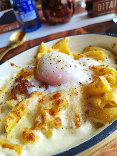 Para comenzar pedimos un plato de pasta cada uno, carbonara y pasta rellena de pera y gorgonzola.... un verdadero acierto. No me deja subir el vídeo, pero el huevito poché de la carbonara estaba en el punto idóneo. La pasta de pera y gorgonzola de las mejores que hemos probado, y la presentación, 10/10.