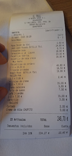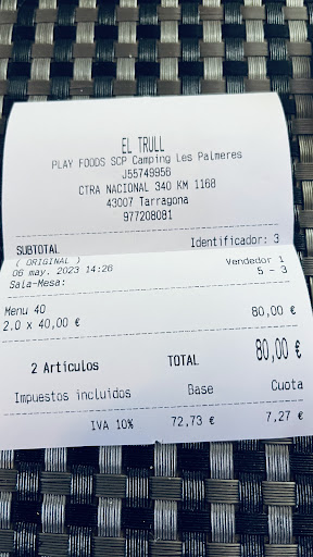 Read moreDéçu Déçu. Ce n'est plus le Trull d'il y a quelques années (il y a encore 2 ans) où on mangeait très bien et pour un prix très raisonnable. Aujourd'hui c'est un piège a touristes où vous trouverez du surgelé ( Poissons et desserts), des plats ridiculement en petites quantités (petit morceau de morue avec 2 feuilles d'artichaut a 25€ ou encore pour les grillades 2 petits morceaux de bœuf avec 2 petits poivrons a 30€). Pour vos légumes faudra prendre un plat supplémentaire a 5€ minimum pour des frites maison ! Le dessert est de la crème de grande surface avec un dessus caramélisé maison. Pour le service, on s'amuse a vous donner le menu en catalan alors quil est demandé précisément en espagnol car pas dispo en français. Les serveurs sont incapable de vous expliquer les types de poissons proposés ! Bref on est loin de qualité des plats servis il y a quelques années par l'ancien propriétaire des lieux. C'est la même cuisine pour touriste servi dans le camping voisin de Las Palmeras. C'est désormais une adresse a éviter et c'est bien dommage. Oubliez les avis d'il y a quelques années et ces menus a 16€/pers. aujourd'hui cest plutôt 60€ par personnes pour un plats dessert et vin ! A fuir, préférez les petits restaurants d'Altafulla dans la vieille ville, bien mieux en qualité et...