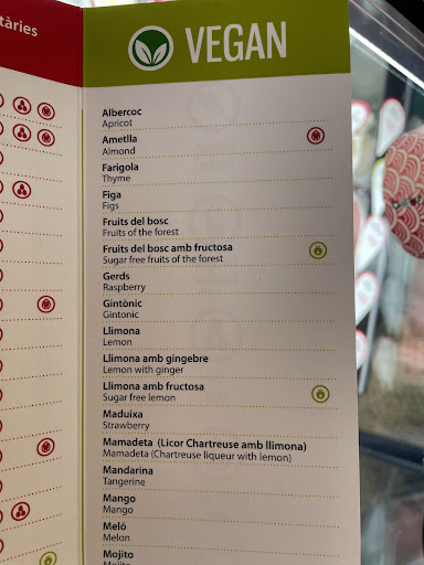 Read moreAlthough the establishment has a Vegan menu full of different and interesting flavors (a LOT of them fruited based, like lemon or strawberry, por example), when we visited they had only a handful. It was disappointing, to be honest. Despite that, the chocolate & orange combined with fruits of the forest was pretty good. The cone was also vegan,...